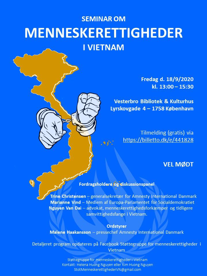 I lyset af disse krænkelser af menneskerettigheder, er der behov for, at vi, i det velkendte frie Danmark, støtter disse stemmer om demokrati og menneskerettigheder. En sammenslutning af en række vietnamesiske foreninger og enkeltpersoner i Danmark; Støttegruppe for menneskerettigheder i Vietnam, vil afholde et seminar om menneskerettigheder for Vietnam.